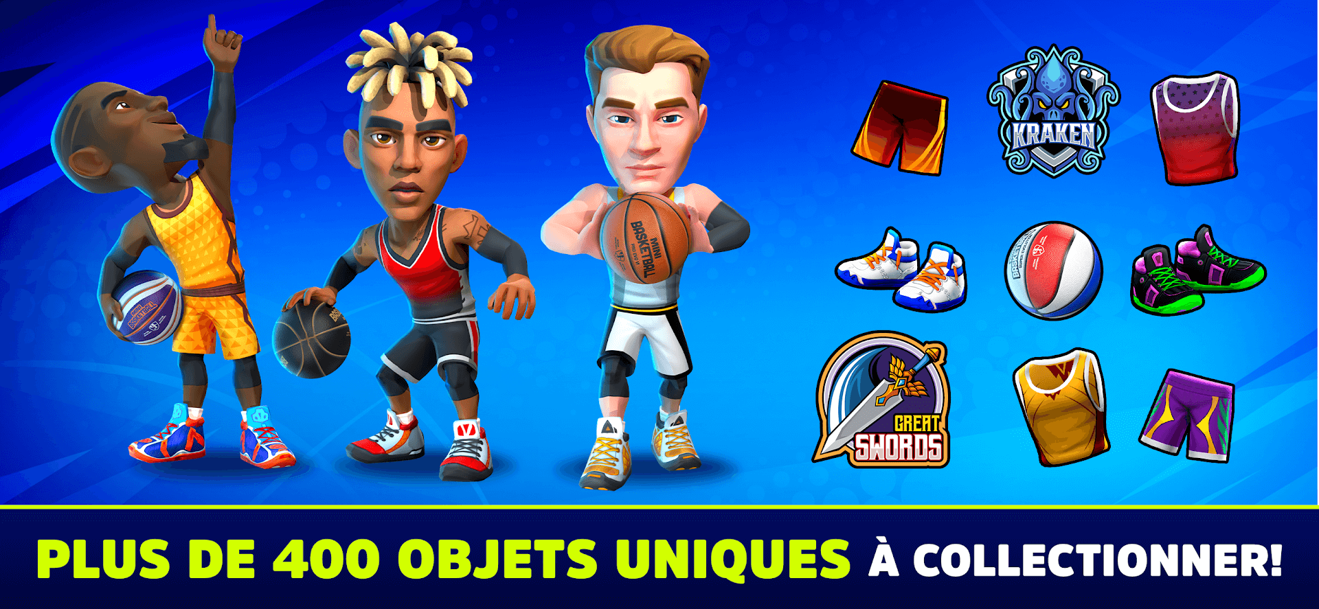Dans Mini Basketball, vous voudrez réellement gagner des joueurs, des plus normaux aux plus épiques, et les mettre à jour pour transformer votre groupe en rivaux les plus redoutés sur n'importe quel terrain. Outre le fait que vous pouvez assembler votre groupe, vous pouvez également l'adapter complètement à votre image avec plus de 100 choix adaptables parmi :